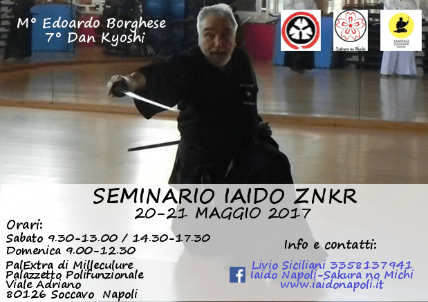 Posted on 18 Maggio 201727 giugno 2017 di francescoiopSeminario Iaido – Maggio 2017 IL SEMINARIO DI MAGGIO CON IL M° EDOARDO BORGHESE VII DAN KYOSHI SI TERRÀ NEI SEGUENTI GIORNI E ORARI: Sabato 20 maggio 2017, ore 09:30 -13:00 / 14:30 – 17:30. Domenica 21 maggio 2017, ore 09:00 – 12:00. Correlati